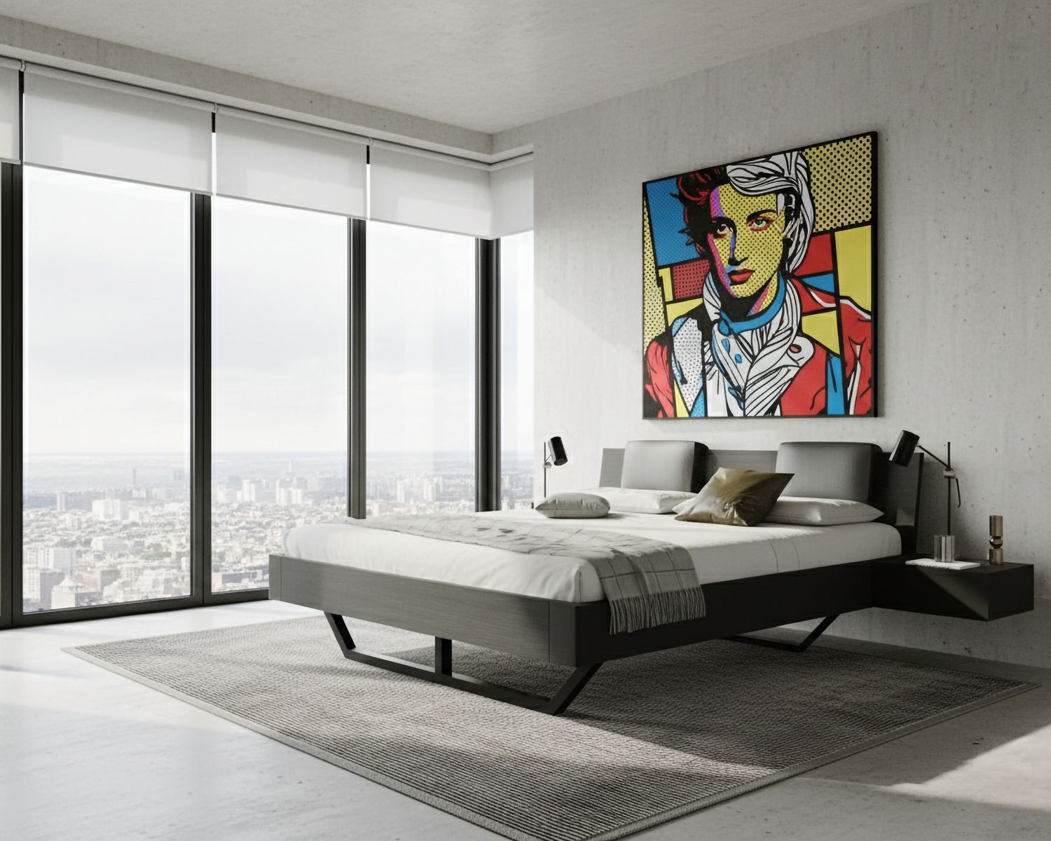 Das schwebende Kufen-Untergestell sorgt für ein Gefühl der Leichtigkeit und macht das Bett zu einem echten Blickfang in Ihrem Schlafzimmer, während die robuste Bauweise für Stabilität und Langlebigkeit sorgt.