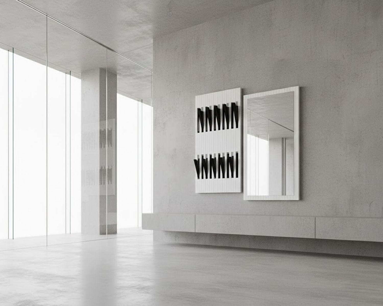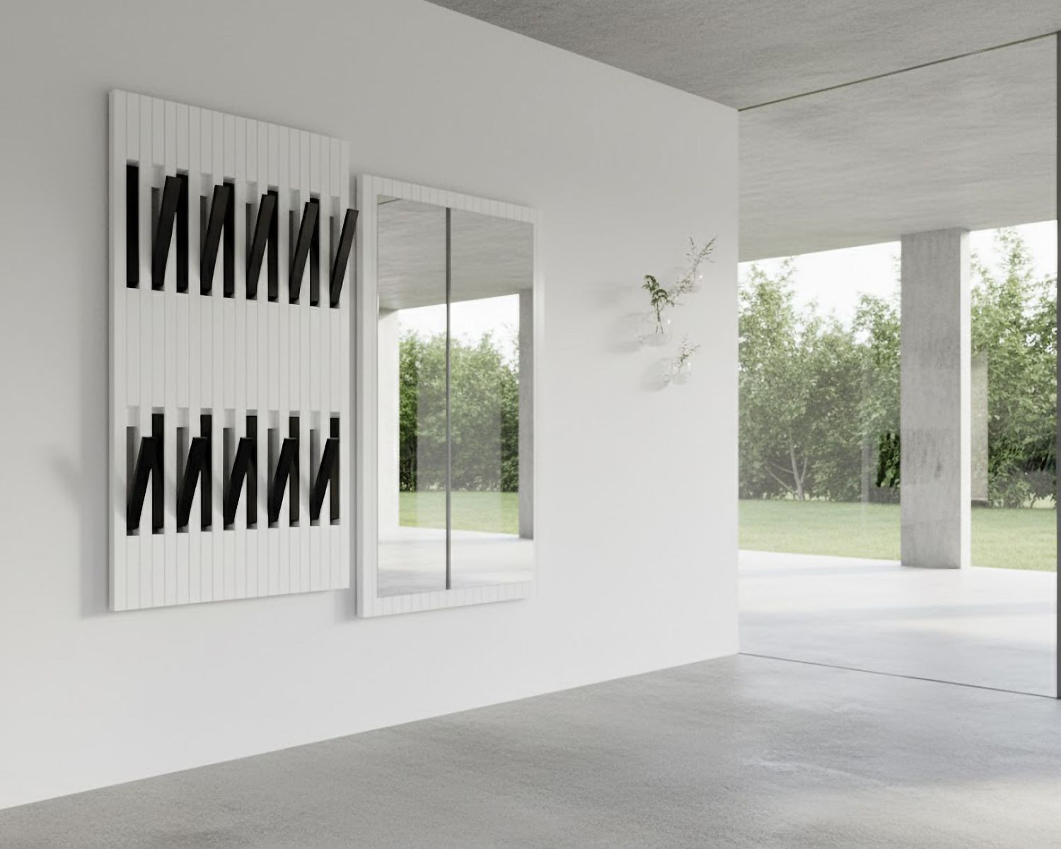 Die Anordnung der Haken erinnert an ein Piano und sind von eben diesem inspiriert worden. So sind jeweils 10 Haken, in 2 Reihen nebeneinander platziert. Diese können Sie bei Bedarf aufklappen, andernfalls ganz bequem im Korpus verschwinden lassen - Ähnlich der Funktionsweise eines Klaviers, dessen eingearbeiteten Hämmer zum Erzeugen des unverwechselbaren Klangs, auf- und wieder zuklappen