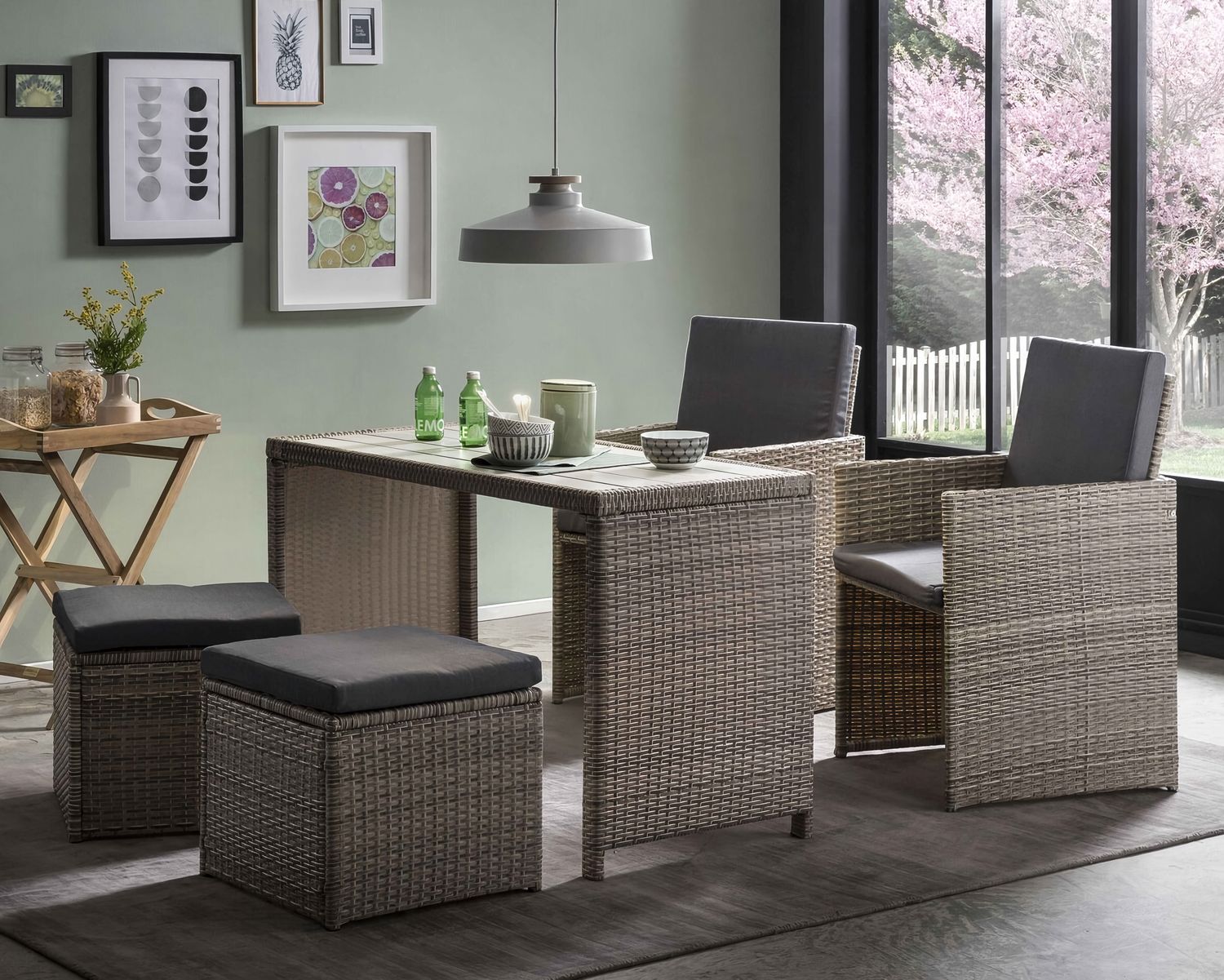 Die Möbilia Novo Sitzgruppe für den Garten besteht aus 2 Stühle, 2 Hocker, 4 Sitzkissen und 1 Tisch. Der Stuhl mit Armlehnen wurde aus Polyrattan gefertigt und ist UV-beständig. Die Tischplatte besteht aus Rattan und wurde sehr hochwertig verarbeitet. Die Sitzkissen haben einen sehr angenehmen Stoff und bietet Ihnen maximalen Sitzkomfort.