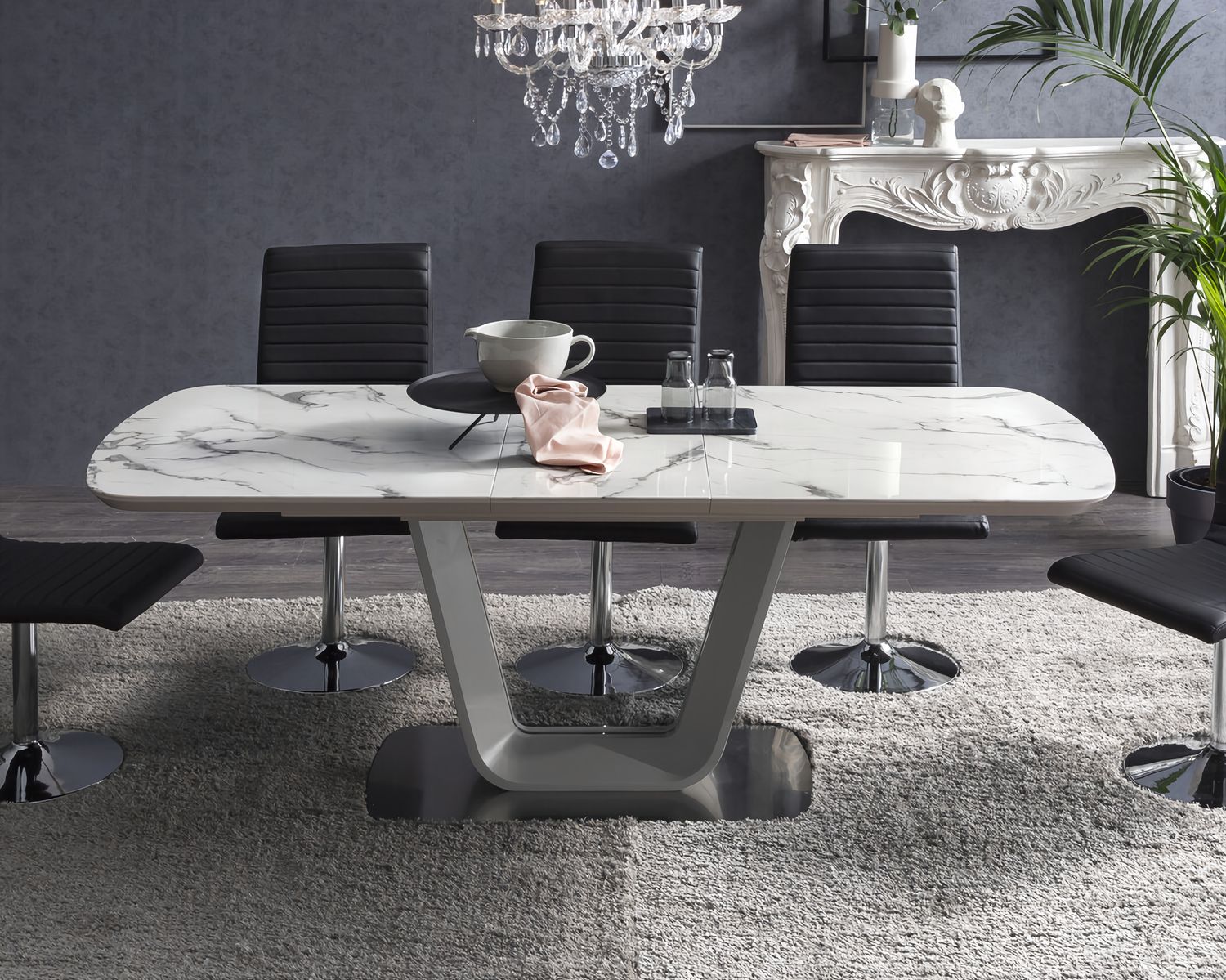 Das neue Herzstück in Ihrem Essbereich ist dieser Esstisch. Die Tischplatte in Marmoroptik wurde aus MDF Holz gefertigt und wird abgerundet durch 5 mm Sicherheitsglas. Das Gestell aus rostfreiem Stahl sieht nicht nur stylisch aus, es verleiht dem Tisch auch eine sehr gute Stabilität. Möbel in Marmor-Optik sind voll im Trend und passen nahezu in jedes Interior. Egal wo Sie diesen Tisch einsetzen, ob Esszimmer oder Geschäftsräume, er ist mehr als nur ein Sitzplatz zum Essen. Hier können ausgedehnte Gesprächsrunden mit Freunden, Familie oder Geschäftspartnern geführt werden. Sollte der Platz einmal nicht ausreichen, können Sie den Tisch dank Ausziehfunktion erweitern.