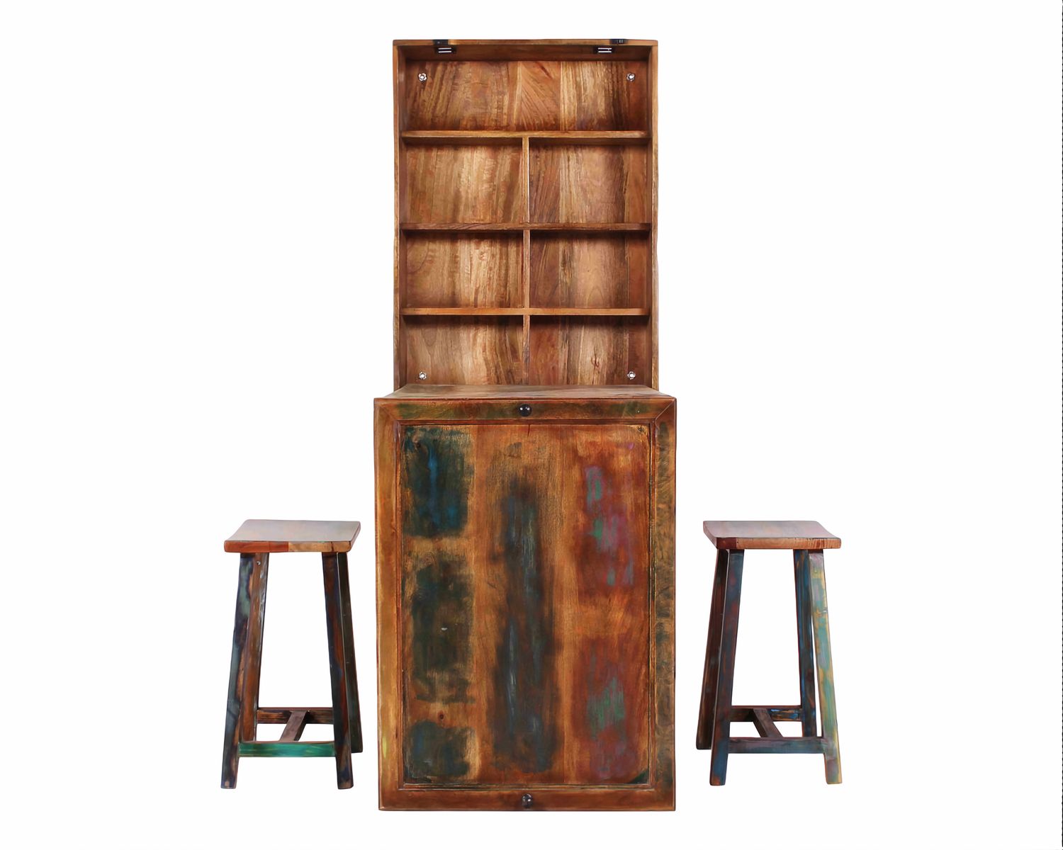 Ein praktischer Wandschrank mit zwei Hockern aus bunt lackiertem Altholz im Shabby-Chic. Sechs kleine Fächer und ein großes Fach bieten Ihnen Stauraum für übersichtliche Ordnung. Ein Boden ist herausnehmbar um Platz für Flaschen und andere höhere Dinge zu schaffen. Der Clou ist die Tür, welche sich zu einem kleinen Tisch aufklappen lässt. Dies ist ideal für kleine Küche oder andere Räume, wo Platz fehlt. Die Hocker verfügen über eine Holzsitzfläche und eine Mittelstrebe um die Füße darauf abzustellen.