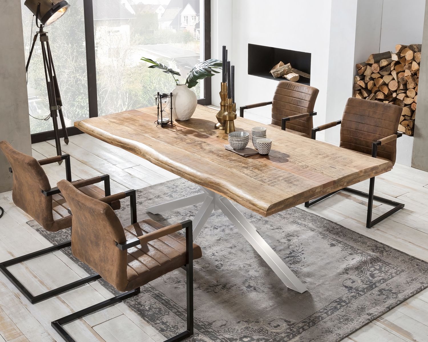 Modern und schick ist diese Esstisch Kombination. Die Esstischplatte mit Baumkante aus massiven Mangoholz, sorgt für eine natürliche Note, während das Gestell modernen Industrie-Flair versprüht.